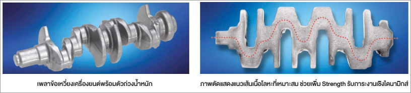 จากการรีดขึ้นรูปโลหะเป็นเส้น/แท่ง/แผ่นในการผลิตวัตถุดิบ ก่อให้เกิดการเรียงตัวของอนุภาคเนื้อโลหะเป็นแนวเส้น การแปรรูปวัตถุดิบให้เป็นผลิตภัณฑ์ด้วยวิธีการที่เหมาะสมจะทำให้แนวเส้นเนื้อโลหะเรียงตัวขนานไปกับผิวชิ้นงานผลิตภัณฑ์นั้นๆ และเพิ่ม Strength รับภาระงานเชิงไดนามิกส์ได้ดียิ่งขึ้น รูปที่ 10 แสดงให้เห็นถึงเพลาข้อเหวี่ยงเครื่องยนต์ 4 สูบ ที่ผ่านการทุบขึ้นรูปมาก่อนการผลิตขั้นต่อไป และแนวเส้นเนื้อโลหะดังกล่าว