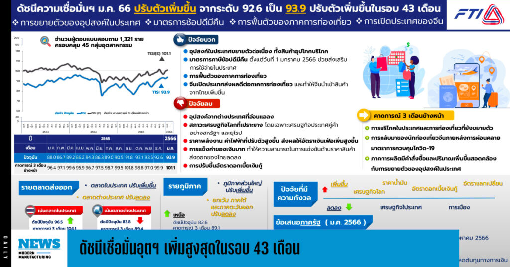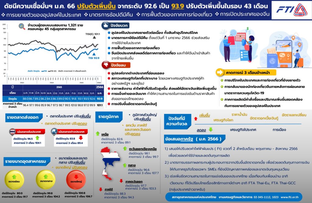 ดัชนีความเชื่อมั่นภาคอุตสาหกรรม เดือนมกราคม 2566 เพิ่มสูงสุดในรอบ 43 เดือน จากการขยายตัวของสินค้าอุปโภคบริโภค และมาตรการช้อปดีมีคืน เสนอรัฐปรับค่าไฟงวด 2 ลดภาระ-ต้นทุนผู้ประกอบการ