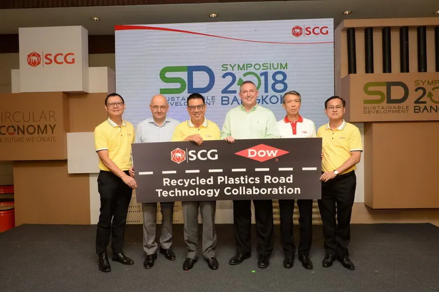 กลุ่มบริษัท ดาว ประเทศไทย และเอสซีจีประกาศโครงการ “ความร่วมมือทางด้านเทคโนโลยีสำหรับถนนจากพลาสติกรีไซเคิล” เพื่อเปลี่ยนขยะพลาสติกให้เป็นส่วนประกอบในการทำถนนยางมะตอย โดยโครงการนี้จะช่วยลดปัญหาขยะพลาสติกในทะเลและชุมชน รวมถึงคุณสมบัติของพลาสติกจะช่วยเพิ่มประสิทธิภาพของถนนพร้อมลดการเกิดก๊าซเรือนกระจกจากการทำถนน