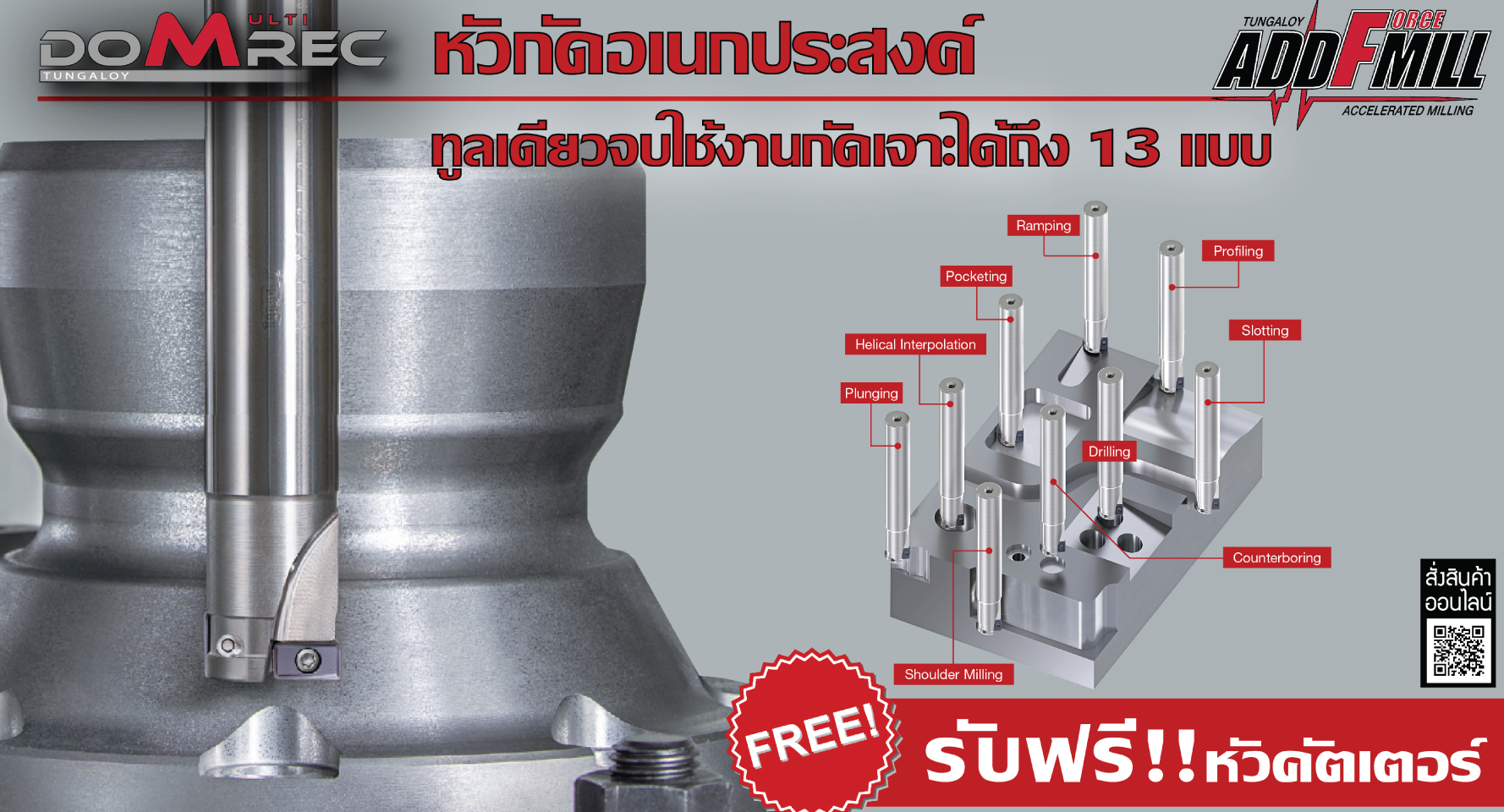 สำหรับผู้ใช้งานเครื่องจักรที่กำลังมองหาทูลที่คุ้มค่ากับการลงทุน ที่สามารถเดินงานกัดงานเจาะครบจบในทูลเดียว DoMultiRec คือคำตอบของคุณ โดยทังกาลอยด์ได้พัฒนา DomultiRec ขึ้นมารองรับผู้ใช้งานที่กำลังหาโซลูชั่นงานกัดเจาะที่หลากหลายและต้องการแนวทางการกัดงานที่เน้นยกระดับรอบการกัดงานของคุณ ซึ่งแน่นอนในปัจจุบันโดยเฉพาะอุตสาหกรรมแม่พิมพ์ มักต้องเจอการกัดเจาะงานที่หลากหลายในชิ้นงานเดียว เช่น งานกัดเจาะ (Plunging) งานกัดบ่าฉาก (Shoulder milling) กัดขึ้นรูป (Profiling) กัดลาดเอียง (Ramping) กัดรูบ่าฉาก (Counter Boring) เป็นต้น เป็นเรื่องธรรมดาที่การลงทุนซื้อทูลย่อมคำนึงถึงความคุ้มค่าเป็นหลัก คุ้มค่าอย่างไรทังกาลอยด์จะอธิบายให้ฟัง