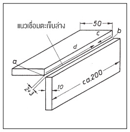 ก) ให้เชื่อมเข้ามุม ด้วยลวดเชื่อมฟลักซ์หนา ทำตะเข็บให้ได้ความหนา a≈4 มม. โดยใช้ลวดเชื่อมขนาดø≈3.25 มม. ตั้งไฟประมาณ 150 A เชื่อมยึดที่ a และ b ของชิ้นงานก่อน แล้วเชื่อมตะเข็บ c จากซ้ายไปขวา ดังรูปที่ 27 รวดเดียวให้ได้ตะเข็บหนา a≈4 มม. ขณะเชื่อมจากซ้ายต้องเอียงลวดไปทางขวา เพื่อไม่ให้น้ำสแลควิ่งออกหน้า ในขณะเดียวกันก็เอียงแบ่งมุมฉากประมาณครึ่งหนึ่ง ดังรูปที่ 26 แล้วลากยาวไปโดยไม่ต้องส่ายลวด จนตะเข็บต่อเข้ากับตะเข็บ c ที่เชื่อมไว้ก่อนหน้า ขณะเชื่อมต้องระวังไม่ให้ไฟอาร์กกินขอบลึก หรือมีสแลคซ่อนอยู่ใต้รอยเชื่อม ดังรูปที่ 28 เพราะจะทำให้เป็นจุดอ่อนของรอยเชื่อม ครูฝึกจะตรวจดูรอยเชื่อมและหักดูด้านใน