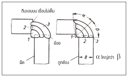 ข) เมื่อฝึกเชื่อมแบบ ก. ได้ดีแล้ว ให้ฝึกเชื่อมพอกตะเข็บ โดยเชื่อมตะเข็บแรกเหมือนแบบฝึก ก. ใช้ลวดเชื่อมขนาดเดิมตั้งไฟประมาณ 50A/มม.ø เคาะสแลคทำความสะอาดรอยเชื่อมให้เรียบร้อยก่อนลงมือเชื่อมพอกโดยใช้ลวดเชื่อมขนาดø≈4 มม. ตั้งไฟประมาณ 40A/มม.ø เชื่อมพอกตะเข็บที่ 2 และ 3 ดังรูปที่ 29 โดยไม่ต้องส่ายลวดเชื่อมลากยาวจากซ้ายไปขวาทั้งสองตะเข็บ ให้ได้ตะเข็บเชื่อมเข้ามุมที่มีความหนา a > 5 มม. ความผิดพลาดในการเชื่อม ดังรูปที่ 30 และ 31 อาจเอื้อให้เกิดการหักในตะเข็บได้ ผู้ฝึกเชื่อมจะเรียนรู้ว่าเฉพาะการเชื่อมตะเข็บแรกในมุมเท่านั้นที่สามารถจี้ลวดเชื่อมฟลักซ์หนาเข้าชิดได้ ดังรูปที่ 32 ตะเข็บ 2 และ 3 ในการเชื่อมพอก เขาจะต้องประคองลวดเชื่อมให้มีระยะห่างออกมาจากตะเข็บแรกประมาณ 2 มม. ดังรูปที่ 33 เพื่อไม่ให้สแลคเหลวไหลคลุมอยู่ที่ปลายลวดเชื่อมแล้วไหลน้ำรอยเชื่อมออกไปก่อน