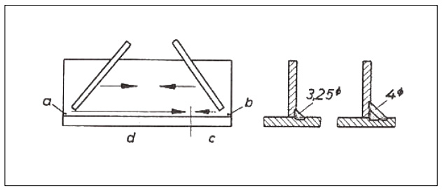 ค) ฝึกเชื่อมพอกเข้ามุมด้วยลวดเชื่อมชนิดฟลักซ์หนาปานกลาง เป็นแบบฝึกเรียนรู้พิเศษ ซึ่งผู้ฝึกเชื่อมจะรู้จักความแตกต่างของพฤติกรรมเปลวอาร์ก การฝึกเริ่มด้วยการเชื่อมยึดเหล็กเป็นรูปตัวทีคว่ำ ที่จุด a และ b ด้วยลวดเชื่อมขนาด ø3.25 มม. ตั้งไฟฟ้าประมาณ 45-50 A/มม.ø จากนั้นเชื่อมตะเข็บ c จากขวาไปซ้าย เคาะสแลคออกและขัดทำความสะอาดด้วยแปรงลวดให้เรียบร้อย แล้วเชื่อมตะเข็บ d โดยลากยาวจาก a จนตะเข็บ d ต่อกับ c ผู้ฝึกจะได้ความรู้สึกว่าน้ำโลหะไหลหน่วงกว่าการเชื่อมด้วยลวดเชื่อมฟลักซ์หนาในแบบฝึกที่ผ่านมา