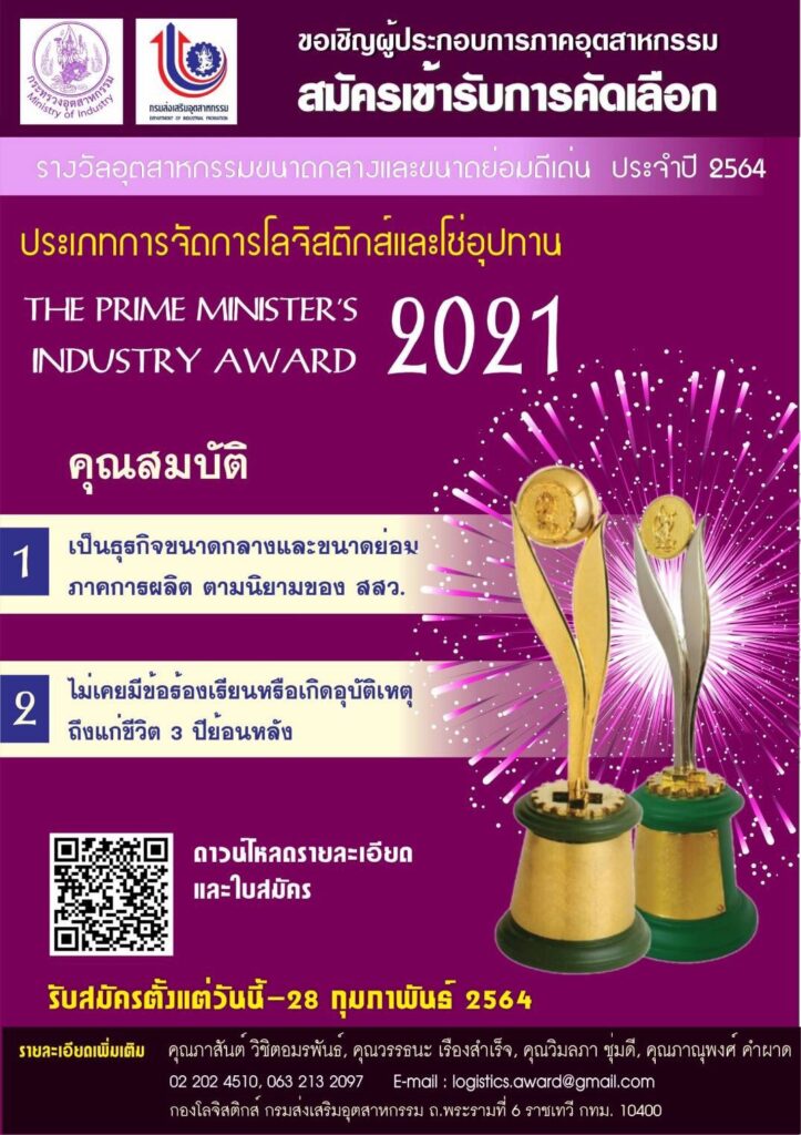 ขอเชิญผู้ประกอบการภาคอุตสาหกรรม สมัครเข้ารับการคัดเลือกรางวัลอุตสาหกรรมขนาดกลางและขนาดย่อมดีเด่น ประเภทการจัดการโลจิสติกส์และโซ่อุปทาน ประจำปี 2564