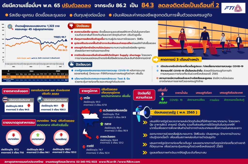 จากการสำรวจผู้ประกอบการ 1,323 ราย ครอบคลุม 45 กลุ่มอุตสาหกรรมของสภาอุตสาหกรรมแห่งประเทศไทยในเดือนพฤษภาคม 2565 พบว่า ปัจจัยที่ผู้ประกอบการมีความกังวลเพิ่มขึ้นได้แก่ ราคาน้ำมัน ร้อยละ 85.5 สภาวะเศรษฐกิจโลก ร้อยละ 65.7 และเศรษฐกิจในประเทศ ร้อยละ 59.0 ตามลำดับ