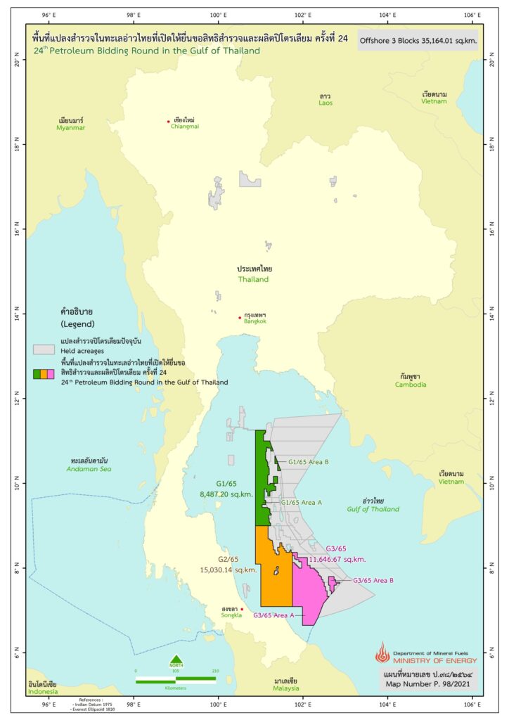 นายสราวุธ แก้วตาทิพย์ อธิบดีกรมเชื้อเพลิงธรรมชาติ (ชธ.) เผยว่า หลังจากนายสุพัฒนพงษ์ พันธ์มีเชาว์ รัฐมนตรีว่าการกระทรวงพลังงาน ได้ลงนามในประกาศเชิญชวนเมื่อวันที่ 7 เมษายน 2565 ในการเปิดให้ยื่นขอสิทธิสำรวจและผลิตปิโตรเลียม ครั้งที่ 24 สำหรับแปลงสำรวจในทะเลอ่าวไทย หมายเลข G1/65 G2/65 และ G3/65 ภายใต้ระบบสัญญาแบ่งปันผลผลิต และเผยแพร่ประกาศเชิญชวนผ่านทางเว็บไซต์กรมเชื้อเพลิงธรรมชาติ เพื่อให้บริษัทที่สนใจสามารถดาวน์โหลดประกาศเชิญชวนและเงื่อนไขต่าง ๆ ได้จากทั่วโลก โดยเปิดห้องศึกษาข้อมูล (Data room) ให้บริษัทต่าง ๆ เข้าศึกษาข้อมูลเบื้องต้นในการจัดทำข้อเสนอการยื่นขอสิทธิฯ พร้อมทั้งจัดประชุม The 24th Thailand Petroleum Bidding Round Conference เพื่อประชาสัมพันธ์ข้อมูล รวมทั้งแนวทาง ข้อกำหนดต่าง ๆ เกี่ยวกับการยื่นขอสิทธิฯ ในรูปแบบออนไลน์ ไปเมื่อวันที่ 27 กรกฎาคม 2565 แล้วนั้น ปรากฏว่ามีบริษัทสนใจยื่นคำขอสิทธิฯ ทั้งสิ้น จำนวน 2 บริษัท