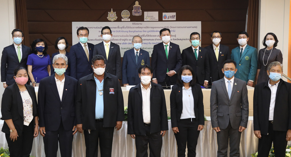 นายจตุพร บุรุษพัฒน์ ปลัดกระทรวงทรัพยากรธรรมชาติและสิ่งแวดล้อม ให้เกียรติเป็นประธานในพิธีลงนามบันทึกข้อตกลง (MOU) 2 ฉบับ ประกอบด้วย บันทึกข้อตกลงความร่วมมือการพัฒนาและฟื้นฟูพื้นที่สีเขียวราชพัสดุภายใต้การดูแลของกรมป่าไม้ (โครงการสวนกลางมหานคร) อำเภอพระประแดง จังหวัดสมุทรปราการ ระหว่าง โครงการ OUR Khung BangKachao โดยมูลนิธิชัยพัฒนา กับกรมป่าไม้ และ บันทึกข้อตกลงความร่วมมือโครงการฟื้นฟูพื้นที่สีเขียวและบริหารจัดการเรียนรู้ สวนเฉลิมพระเกียรติพระบาทสมเด็จพระเจ้าอยู่หัว 80 พรรษา ต.ทรงคนอง อ.พระประแดง จ.สมุทรปราการ ระหว่าง กรมป่าไม้ กับ บริษัท ปตท. จำกัด (มหาชน) (ปตท.) ณ สำนักงานมูลนิธิชัยพัฒนา