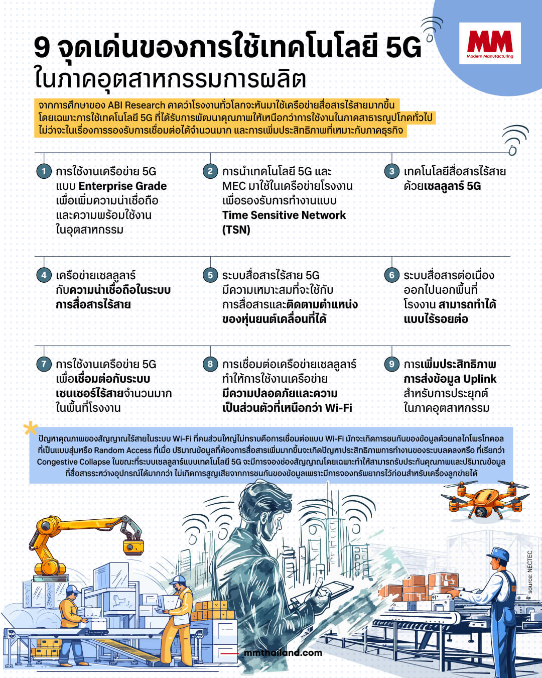 เทคโนโลยี 5G มีความโดดเด่นในการนำไปใช้ในภาคอุตสาหกรรมการผลิต ซึ่งจากการศึกษาของ ABI Research คาดว่าโรงงานทั่วโลกจะหันมาใช้เครือข่ายสื่อสารไร้สายมากขึ้น โดยเฉพาะการใช้เทคโนโลยี 5G ที่ได้รับการพัฒนาคุณภาพให้เหนือกว่าการใช้งานในภาคสาธารณูปโภคทั่วไป ไม่ว่าจะในเรื่องการรองรับการเชื่อมต่อได้จำนวนมาก และการเพิ่มประสิทธิภาพที่เหมาะกับภาคธุรกิจ