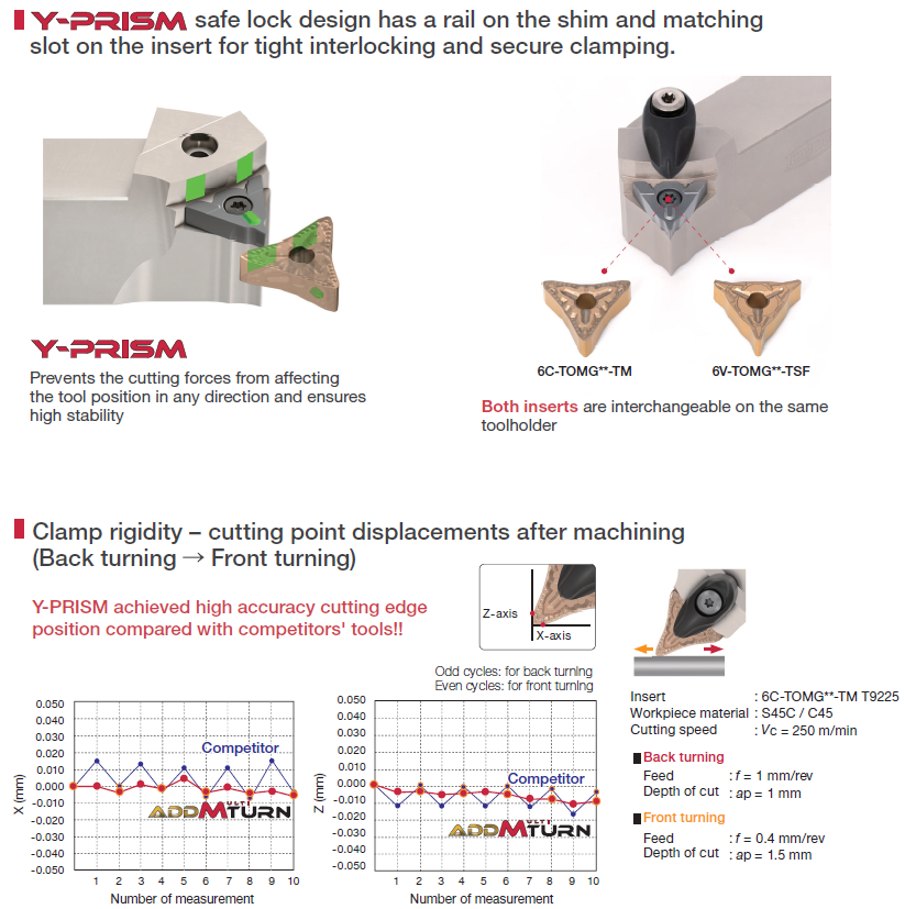 + ด้วยการออกแบบระบบจับยึดเม็ดมีด แบบ Y-Prism ที่ประสานการจับยึดระหว่างชิมและเม็ดมีดได้อย่างแน่นหนาและ ป้องกันไม่ให้แรงตัดกระทบตำแหน่งเครื่องมือในทุกทิศทาง