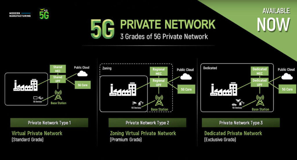 - Private 5G Network – สร้างและปรับแต่งเครือข่ายเคลื่อนที่ไร้สายความเร็วสูงที่มีความเป็นส่วนตัวและความปลอดภัย ซึ่ง AIS 5G ได้แบ่งเกรดของการให้บริการออกเป็น 3 แบบเพื่อให้เหมาะสมกับความต้องการ ได้แก่