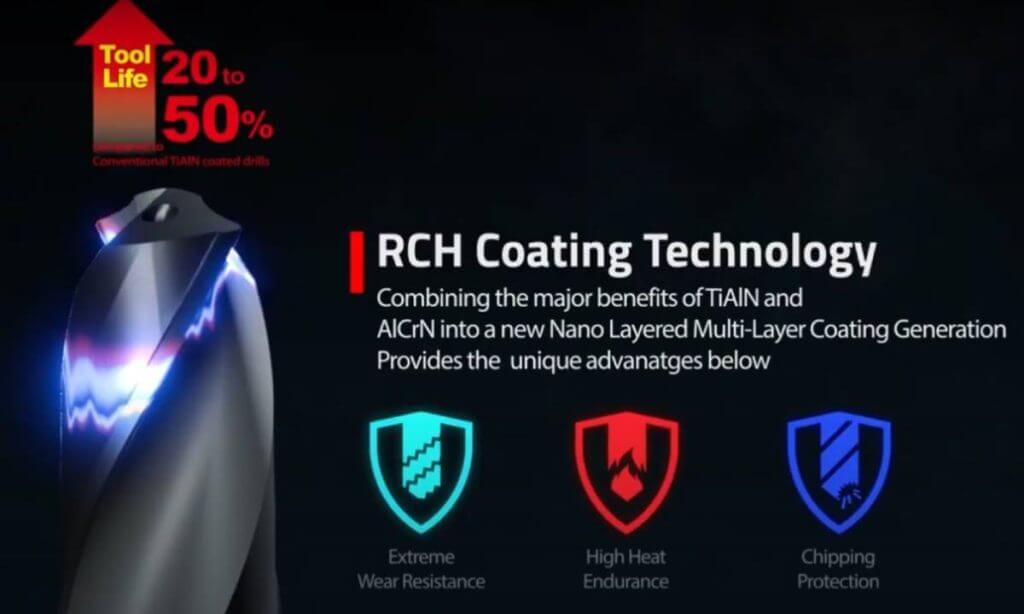 - การเคลือบผิวแบบ RCH (RCH Coating) เพิ่มความต้านทานการสึกหรอของเครื่องมือ เรียกได้ว่าเพิ่มทั้งความแข็งและความเหนียว ช่วยยืดอายุการใช้งานเครื่องมือให้สูงขึ้นถึง 20-50% เมื่อเทียบกับดอกสว่านโซลิดคาร์ไบด์ที่เคลือบ TiAlN แบบทั่วไป