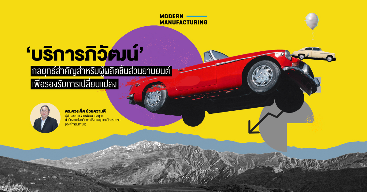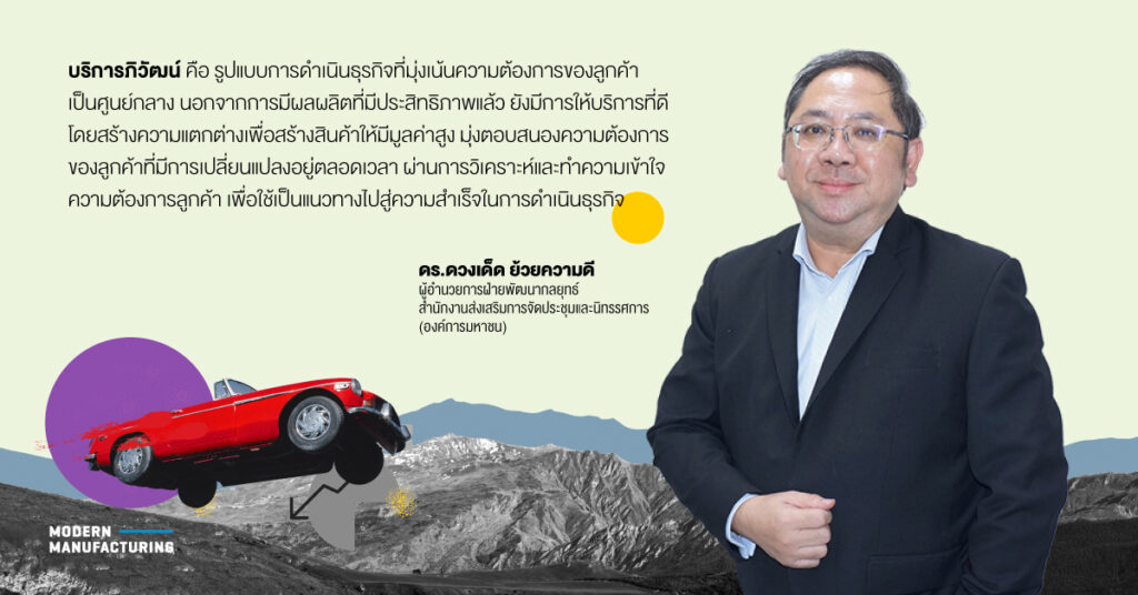 เศรษฐกิจและการผลิตโลกกำลังอยู่ท่ามกลางความเปลี่ยนแปลงครั้งใหญ่ ไม่ว่าจะเป็นผลกระทบจากโรคภัย ความต้องการที่เปลี่ยนแปลงอย่างรวดเร็วของตลาด ไปจนถึงความต้องการแบบจำเพาะเจาะจงของผู้บริโภค ซึ่งสำหรับเมืองไทยแล้วอุตสาหกรรมยานยนต์ซึ่งเป็นอุตสาหกรรมสำคัญของประเทศก็ได้รับผลกระทบอย่างหลีกเลี่ยงไม่ได้ โดยเฉพาะอย่างยิ่งผู้ผลิตชิ้นส่วนยานยนต์ซึ่งมีอยู่จำนวนมาก เพื่อให้สามารถก้าวต่อไปและเพิ่มโอกาสการแข่งขันที่กำลังจะเกิดขึ้นในอนาคต ดร.ดวงเด็ด ย้วยความดี ผู้อำนวยการฝ่ายพัฒนากลยุทธ์ สำนักงานส่งเสริมการจัดประชุมและนิทรรศการ (องค์การมหาชน) หรือ TCEB ในฐานะผู้ใกล้ชิดกับภาคอุตสาหกรรมจึงได้นำเสนอแนวทาง ‘บริการภิวัฒน์’ ที่จะช่วยให้ผู้ผลิตสามารถเข้าถึงผู้บริโภคได้อย่างมีประสิทธิภาพมากขึ้น