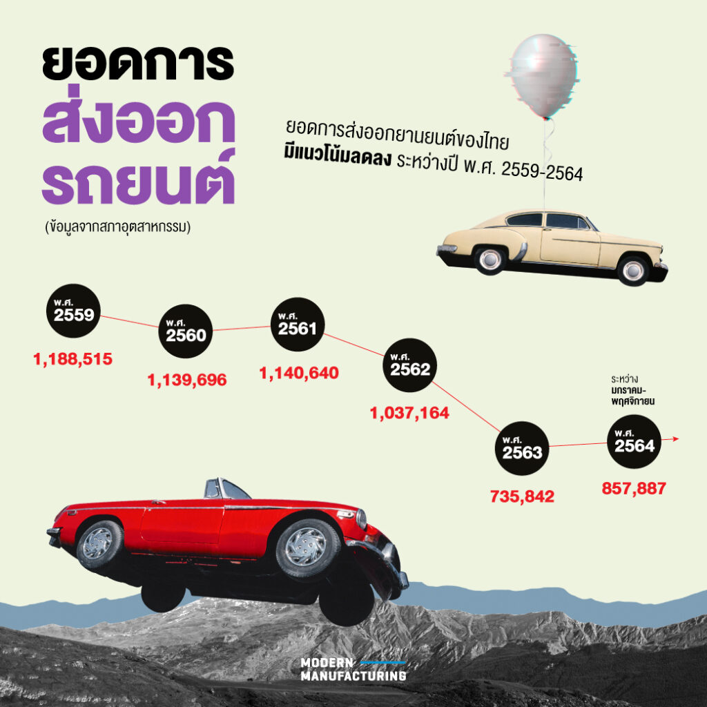 ในขณะที่ยอดการส่งออกยานยนต์ของไทยมีแนวโน้มลดลง ระหว่างปี พ.ศ.2559-2564 พบว่ามีการส่งออกยานยนต์จำนวน 1,188,515 คัน ในปี พ.ศ.2559 และ จำนวน 857,887 คัน ในระหว่าง มกราคม-พฤศจิกายน ปี พ.ศ. 2564 สาเหตุมาจากความสามารถในการผลิตรถยนต์ และการลงทุนทางด้านเทคโนโลยีและการผลิตที่เพิ่มขึ้นของประเทศคู่แข่ง อาทิ ประเทศอินโดนีเซีย ประเทศบังกลาเทศ และประเทศเวียดนาม