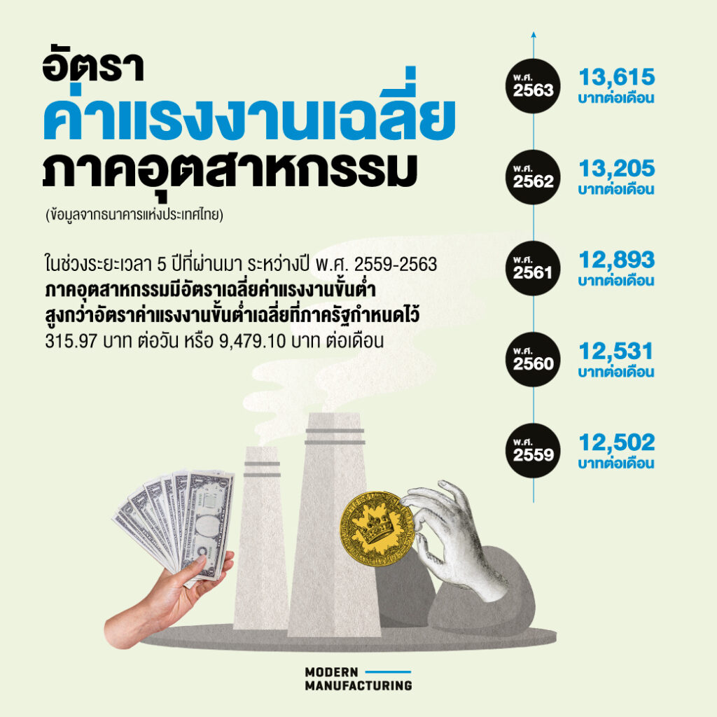 นอกจากนี้ผู้ประกอบการยังเผชิญกับต้นทุนในการดำเนินธุรกิจสูงขึ้นทุกปี เช่น ต้นทุนค่าจ้างแรงงาน ต้นทุนค่าขนส่ง ต้นทุนการผลิตจากการใช้เทคโนโลยีที่ล้าสมัย รวมถึงการขาดทักษะแรงงานที่มีความชำนาญ เป็นต้น ในช่วงระยะเวลา 5 ปีที่ผ่านมา ระหว่างปี พ.ศ. 2559-2563 ภาคอุตสาหกรรมมีอัตราเฉลี่ยค่าแรงงานขั้นต่ำสูงกว่าอัตราค่าแรงงานขั้นต่ำเฉลี่ยที่ภาครัฐกำหนดไว้ 9,479.10 บาท ต่อเดือน อย่างต่อเนื่องโดยในปี พ.ศ. 2559 ค่าแรงงานเฉลี่ยอยู่ที่ 12,502 บาท ต่อเดือน และในปี พ.ศ. 2563 ค่าแรงงานเฉลี่ยอยู่ที่ 13,615 บาท ต่อเดือน
