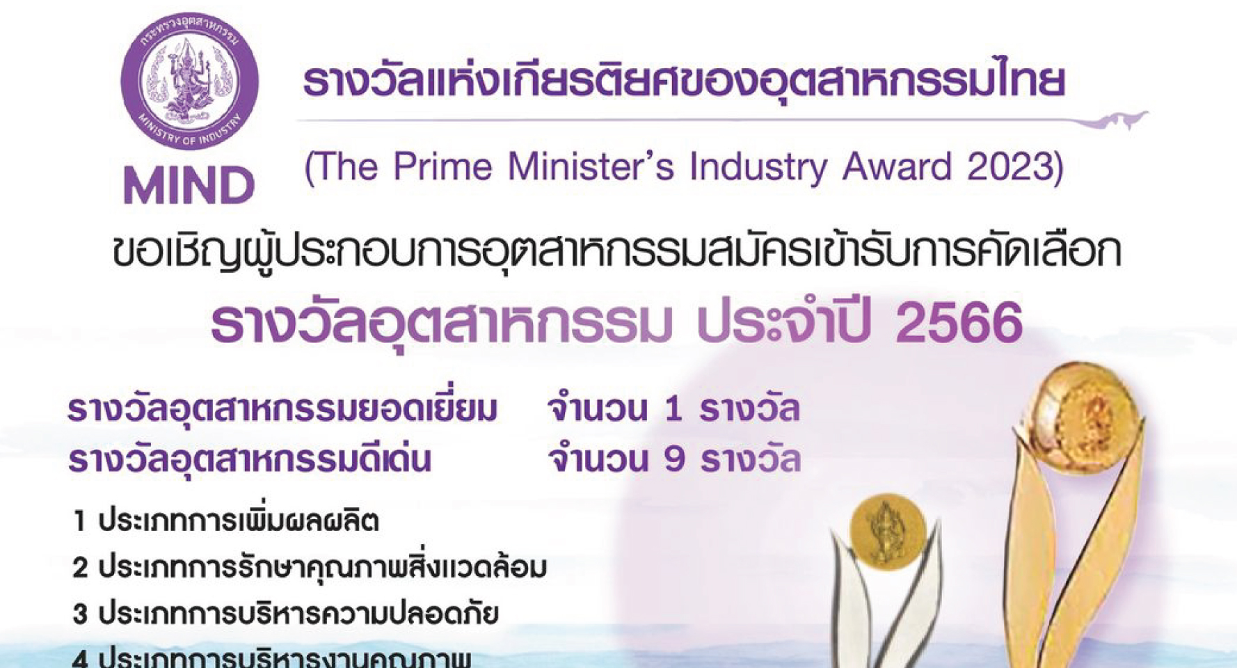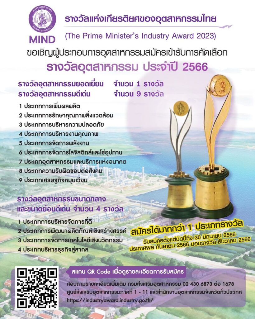 กระทรวงอุตสาหกรรม ขอเชิญผู้ประกอบการอุตสาหกรรม สมัครเข้ารับการคัดเลือก “รางวัลอุตสาหกรรม” ประจำปี 2566 รางวัลแห่งเกียรติยศของอุตสาหกรรมไทย (The Prime Minister’s Industry Award 2023)