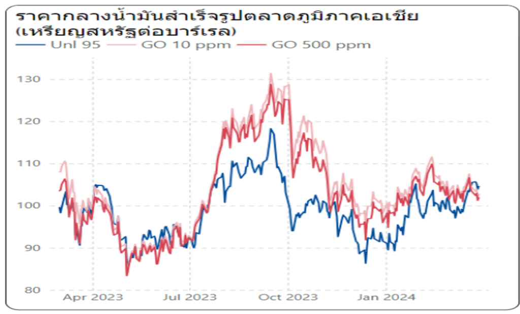 ทั้งนี้ ภาพรวมสถานการณ์ราคาน้ำมันโลก (ระหว่างวันที่ 25 – 31 มีนาคม 2567) ราคาน้ำมันดิบดูไบ ทรงตัวอยู่ที่ระดับ 85.76 เหรียญสหรัฐต่อบาร์เรล ราคาน้ำมันดิบเวสต์ เท็กซัส ทรงตัวอยู่ที่ระดับ 82.25 เหรียญสหรัฐต่อบาร์เรล อย่างไรก็ตาม ขณะที่นักวิเคราะห์คาดการณ์ว่ากลุ่มโอเปกพลัสมีแนวโน้มที่จะคงนโยบายปรับลดกำลังการผลิตจนกว่าจะมีการประชุมเต็มรูปแบบในเดือนมิถุนายน 2567 นี้ สำหรับราคากลางน้ำมันสำเร็จรูปตลาดภูมิภาคเอเชีย ราคาน้ำมันเบนซินออกเทน 95 ทรงตัวอยู่ที่ระดับ 104.84 เหรียญสหรัฐต่อบาร์เรล ส่วนราคาน้ำมันดีเซลหมุนเร็ว (10 PPM) เฉลี่ยอยู่ที่ระดับ 103.05 เหรียญสหรัฐต่อบาร์เรล ปรับตัวลดลงจากสัปดาห์ที่แล้ว 2.59 เหรียญสหรัฐต่อบาร์เรล