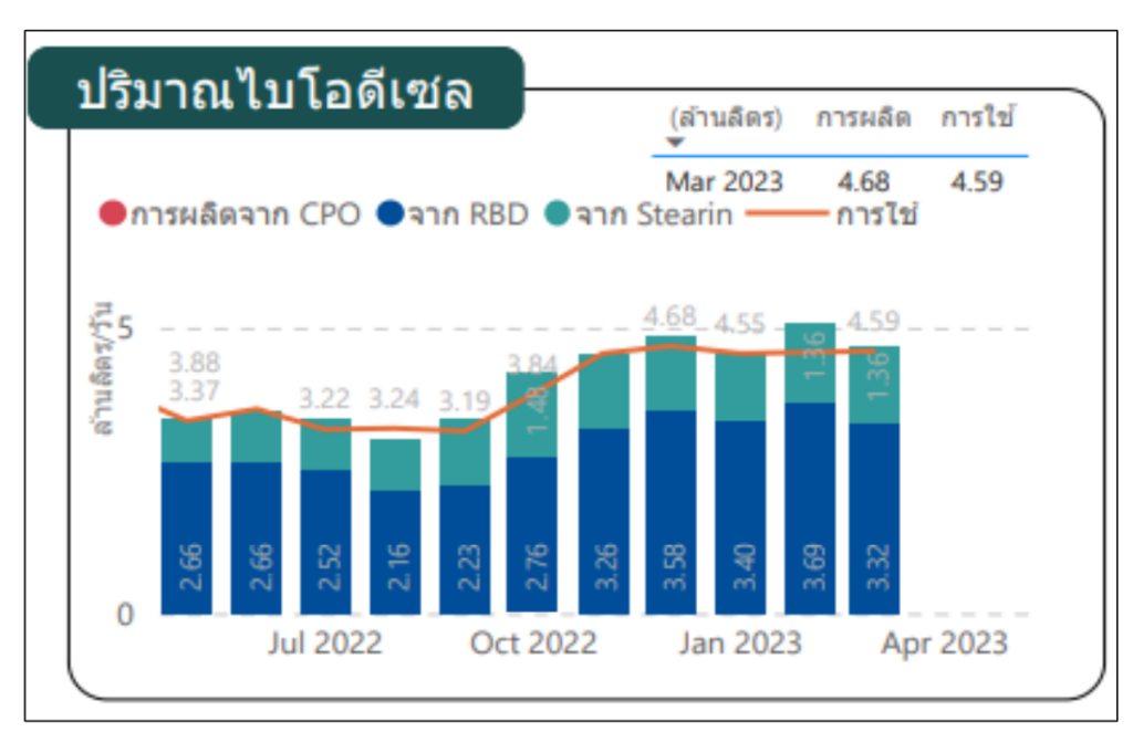 ทั้งนี้ จากข้อมูลปริมาณการใช้เดือนกุมภาพันธ์ 2566 พบว่ามีการใช้น้ำมันดีเซลประมาณ 68.13 ล้านลิตรต่อวัน เพิ่มขึ้นจากเดือนมกราคม 2566 ประมาณ 0.72 ล้านลิตรต่อวัน ซึ่งปริมาณใช้น้ำมันไบโอดีเซล B100 ในเดือนมีนาคม 2566 เท่ากับ 4.59 ล้านลิตรต่อวัน สูงกว่าเดือน กุมภาพันธ์ 2566 เท่ากับ 0.02 ล้านลิตรต่อวัน ทั้งนี้ปริมาณการผลิตน้ำมันไบโอดีเซลประมาณ 4.68 ล้านลิตรต่อวัน ต่ำกว่าเดือนกุมภาพันธ์ 2566 ประมาณ 0.38 ล้านลิตรต่อวัน