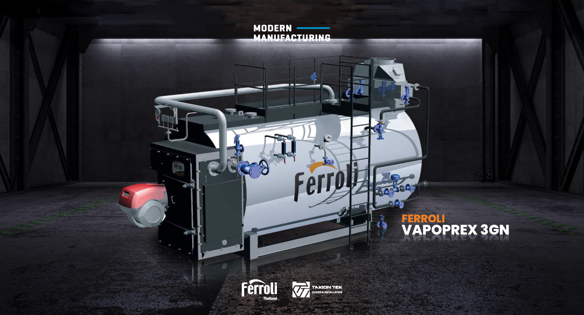 FERROLI มีความเชี่ยวชาญในด้านการผลิตและพัฒนาหม้อไอน้ำมาอย่างยาวนานกว่า 65 ปี ภายใต้การควบคุมมาตรฐาน CE ซึ่งเป็นมาตรฐานของสหภาพยุโรปที่ให้ความสําคัญอย่างมากกับเรื่องความปลอดภัย และการรักษาสิ่งแวดล้อม ซึ่งการได้รับมาตรฐานนี้สะท้อนให้เห็นถึงความรับผิดชอบที่มีต่อชุมชนรอบข้างและสิ่งแวดล้อม ด้วยภายใต้การดูแลของ TakionTek ตัวแทนจําหน่ายอย่างเป็นทางการในประเทศไทย ซึ่งมีความพร้อมในการให้บริการตั้งแต่การออกแบบ ติดตั้งและบริการหลังการขาย ด้วยทีมงานที่มีประสบการณ์ด้านหม้อไอน้ำโดยตรง โดยหม้อไอน้ำ Fire Tube จาก FERROLI ที่มีความน่าสนใจทั้งในด้านต้นทุนและประสิทธิภาพในการใช้งาน คือ VAPOPREX 3GN