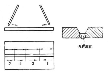 การเชื่อมตะเข็บแรกในร่อง V ต้องเชื่อมให้ทะลุมีรอยตะเข็บเชื่อมเกิดขึ้นด้านใต้อย่างสม่ำเสมอสวยงามช่างเชื่อมอาจใช้วิธีส่ายปลายลวดเชื่อมเดินหน้าสลับถอยหลังในร่องโดยให้ส่ายเดินหน้าเร็วกว่าถอยหลังเล็กน้อย ดังรูปที่ 41