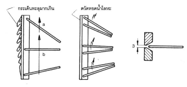 ตั้งไฟ ≈ 140-150 A เชื่อมตะเข็บแรกในร่อง V โดยให้เดินลวดเชื่อมขึ้นด้านบนแผ่นชิ้นงานสร้างตะเข็บ a ยาวประมาณ 20 มม. จากนั้นจึงเดินตะเข็บ b ยาวขึ้นไปช่างเชื่อมจะสังเกตเห็นความผันผวนของเปลวไฟอาร์กโน้มสู่ด้านบน