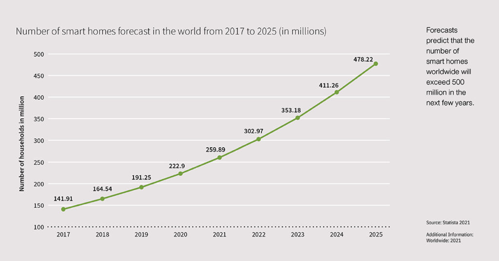 อาคารอัจฉริยะและบ้านอัจฉริยะเป็นที่นิยมเพิ่มมากขึ้นเรื่อย ๆ และคาดว่าจำนวนดังกล่าวจะเพิ่มขึ้นอย่างมากในปีต่อ ๆ ไป ในปัจจุบันจำนวนบ้านอัจฉริยะทั่วโลกมีประมาณมากกว่า 200 ล้านแห่ง และคาดการณ์ว่าตัวเลขนี้จะเกิน 500 ล้านภายในอีกไม่กี่ปีข้างหน้า (รูปที่ 1)
