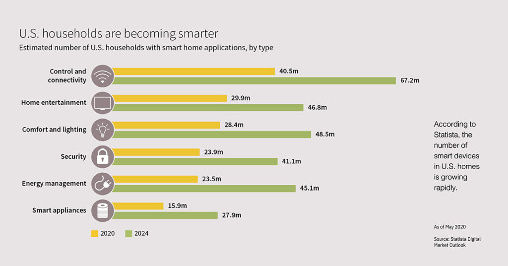 จากการสำรวจของ Statista ที่ดำเนินการในเยอรมนีในปี 2564 โดยมีผู้ตอบแบบสอบถามจำนวน 3,000 ที่มีอายุระหว่าง 18 ถึง 64 ปี ซึ่งเกือบสามในสี่เป็นเจ้าของอุปกรณ์สมาร์ทโฮมอย่างน้อยหนึ่งเครื่อง ในสหรัฐอเมริกามีตัวเลขสัดส่วนที่คล้ายคลึงกัน (รูปที่ 2) ในขณะที่ในประเทศจีนเปอร์เซ็นต์ของผู้ใช้อุปกรณ์สมาร์ทโฮมสูงถึง 90% อุปกรณ์มีความหลากหลายตามการใช้งาน ไม่ว่าจะเป็นระบบไฟแสงสว่าง, อุปกรณ์รักษาความปลอดภัย, เครื่องใช้ไฟฟ้า เช่น ทีวี แล็ปท็อป และซาวด์บาร์ เป็นต้น, เครื่องใช้ในครัว และเครื่องปรับอากาศ แต่อุปกรณ์เหล่านี้กำลังมีความต้องการใช้พลังงานเพิ่มขึ้นซึ่งเป็นผลที่ไม่พึงประสงค์ โดยเฉพาะอย่างยิ่งในช่วงเวลาที่ต้นทุนพลังงานสูงขึ้น เมื่อลูกค้าต้องการอุปกรณ์ที่ประหยัดพลังงาน มีความยั่งยืน และเป็นมิตรกับสิ่งแวดล้อม ยิ่งไปกว่านั้นโครงสร้างพื้นฐานของกริดยังอยู่ภายใต้ความตึงเครียดที่เพิ่มมากขึ้นอีกด้วย