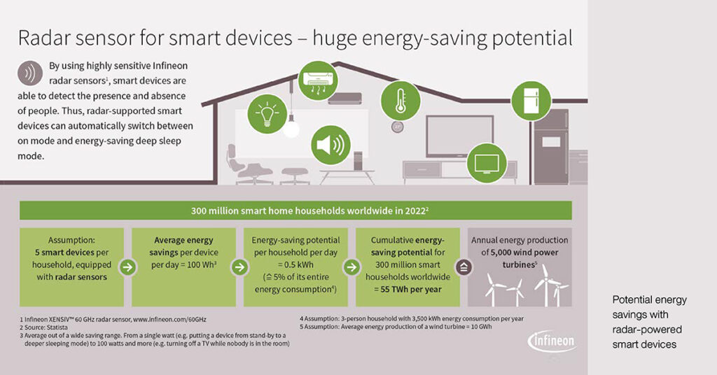 จำนวนแอปพลิเคชันบ้านอัจฉริยะและอุปกรณ์ที่เชื่อมต่อเรดาร์เซ็นเซอร์ มีกำลังเติบโตเพิ่มมากขึ้น ทำให้ชีวิตประจำวันของผู้ใช้ สะดวกสบายมากขึ้น อย่างไรก็ตามก็ส่งผลให้มีการใช้พลังงานสูงขึ้น เนื่องจากอุปกรณ์เหล่านี้มักจะเปิดทำงานอย่างถาวร หรืออยู่ในโหมดสแตนด์บายเพื่อให้พร้อมใช้งานได้ตลอดเวลาแม้ว่าจะไม่มีใครอยู่ก็ตาม ด้วยการติดตั้งอุปกรณ์อัจฉริยะที่มีเรดาร์เซ็นเซอร์ Infineon XENSIV™ 60-GHz อุปกรณ์เหล่านี้ก็จะประหยัดพลังงานและยังมีความชาญฉลาดและยั่งยืนมากขึ้นอีกด้วย