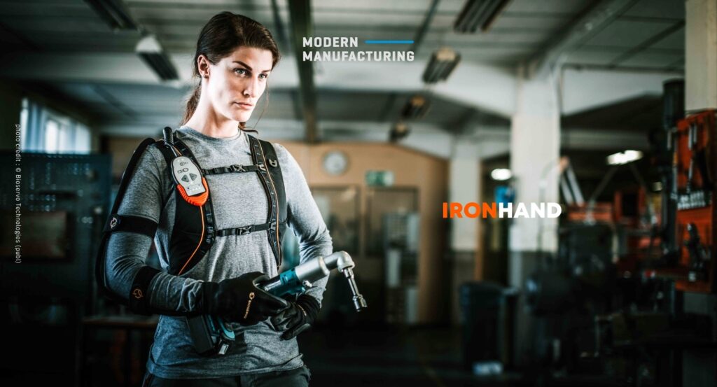 การทำงานในโรงงานอุตสาหกรรมนั้นมาพร้อมกับความเสี่ยงและภาระหลากหลายประการ ซึ่งการทำงานซ้ำ ๆ ไปมานั้นก่อให้เกิดการเจ็บปวดเรื้องรังได้อย่างง่ายดาย Bioservo จึงได้พัฒนาอุปกรณ์สวมใส่ที่ชื่อ Ironhand ขึ้นมา ซึ่งเป็นเหมือนกับกระเป๋าสะพายหลังที่บรรจุแบตเตอรี่เชื่อมต่อกับเส้นเอ็นสังเคราะห์ไปยังถุงมือ มีเซนเซอร์อยู่ที่ปลายนิ้วแต่ละนิ้วและจะสั่งให้มอเตอร์ทำงานเมื่อเกิดการหยิบจับวัตถุขึ้น