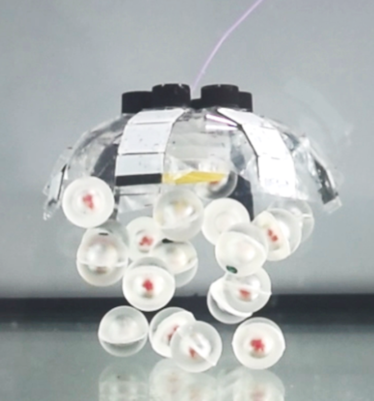 โดยเมื่อ Jellyfish-bot ทำการว่ายขึ้นสู่ผิวน้ำนั้น ก็จะเกิดน้ำวนขึ้นใต้ลำตัวของหุ่นยนต์และจับวัตถุรอบตัวเข้ามาเหมือนอย่างที่แมงกะพรุนตามธรรมชาติทำ ฟีเจอร์เช่นนี้เองที่ช่วยให้ Jellyfish-bot สามารถทำการดักจับขยะขึ้นไปบนพื้นผิวทะเลได้และยังสามารถช่วยในการเก็บตัวอย่างวัตถุในทะเลอย่างไข่ปลาขึ้นมาสู่ผิวน้ำได้อีกด้วย