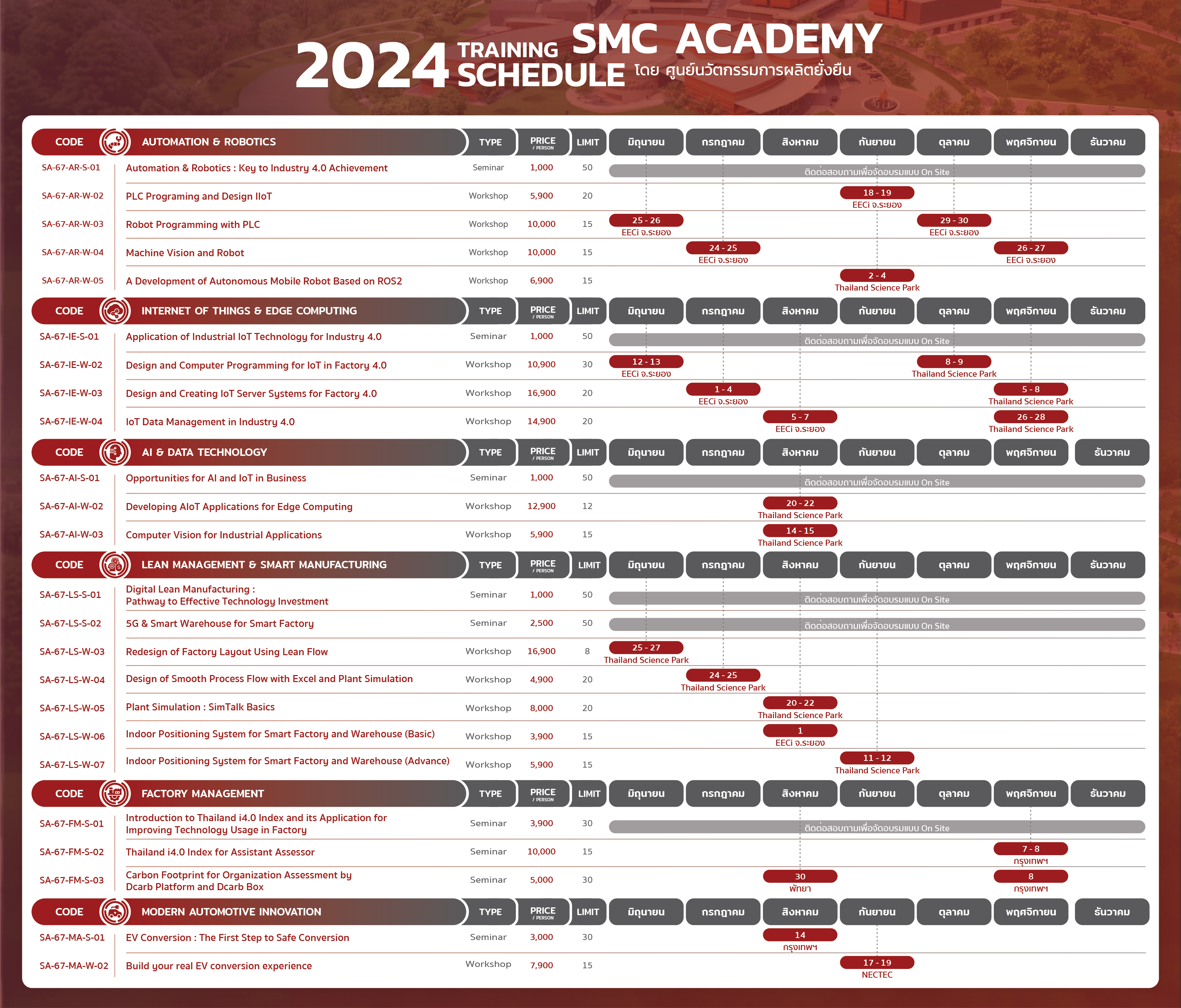 ศูนย์ฝึกอบรม SMC ACADEMY มีแผนการจัดอบรมในปี 2567 ในช่วงเดือน มิ.ย. – ธ.ค. 2567 ตามปฏิทินการจัดอบรม โดยมีเป้าหมายที่จะจัดอบรมบุคลากรในอุตสาหกรรมจำนวน 500 คน ซึ่งหลักสูตรสามารถจัดแบบ Customize ได้ตามความต้องการของอุตสาหกรรม หรือทางอุตสาหกรรมสามารถเลือกหลักสูตรอบรมตามชุดหลักสูตรที่ทาง SMC ACADEMY ออกแบบขึ้นมาโดยมี 7 ชุดหลักสูตร (ที่ควรเรียนต่อเนื่องกัน) ได้แก่