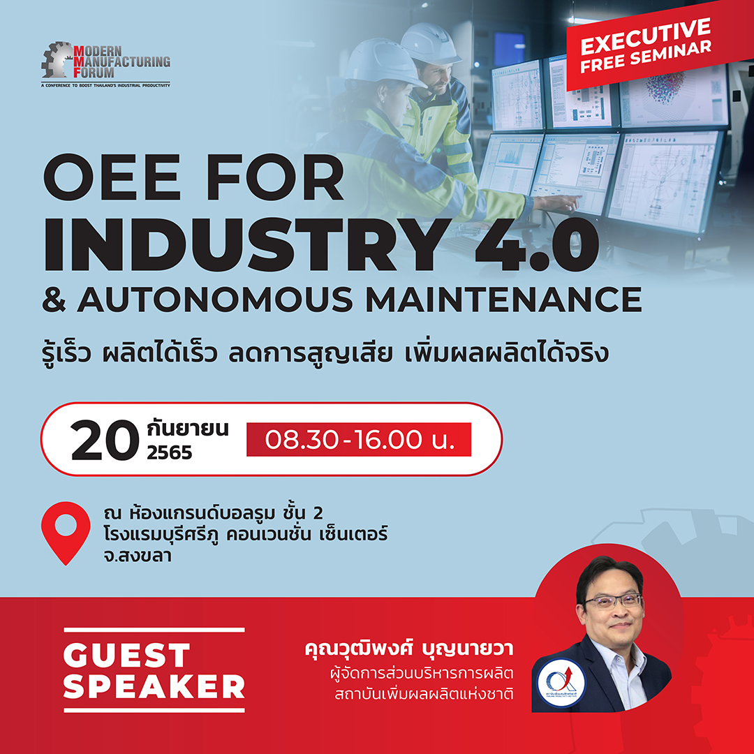Modern Manufacturing Forum งานสัมมนาและแสดงสินค้าเทคโนโลยีอุตสาหกรรม วัน อังคาร ที่ 20 กันยายน 2565 เวลา 08.30 – 16.00 น. ณ ห้องแกรนด์บอลรูม ชั้น 2 โรงแรมบุรีศรีภู คอนเวนชั่น เซ็นเตอร์ จ.สงขลา