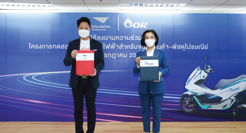 นางสาวจิราพร ขาวสวัสดิ์ ประธานเจ้าหน้าที่บริหารและกรรมการผู้จัดการใหญ่ บริษัท ปตท. น้ำมันและการค้าปลีก จำกัด (มหาชน) (OR) พร้อมด้วย ดร.ดนันท์ สุภัทรพันธุ์ กรรมการผู้จัดการใหญ่ บริษัท ไปรษณีย์ไทย จำกัด ร่วมลงนามบันทึกความเข้าใจโครงการทดสอบยานพาหนะไฟฟ้าสำหรับขนส่งสินค้าและพัสดุ ระหว่าง OR และ ไปรษณีย์ไทย นำร่องการใช้รถจักรยานยนต์ไฟฟ้า (EV Bike) เพื่อขนส่งสินค้าและพัสดุ โดยมี นายณัฐชัย ศรีโสวรรณา หัวหน้าเจ้าหน้าที่บริการกลุ่มงานวางแผนธุรกิจ บริษัท ไทยฮอนด้า จํากัด ร่วมงาน
