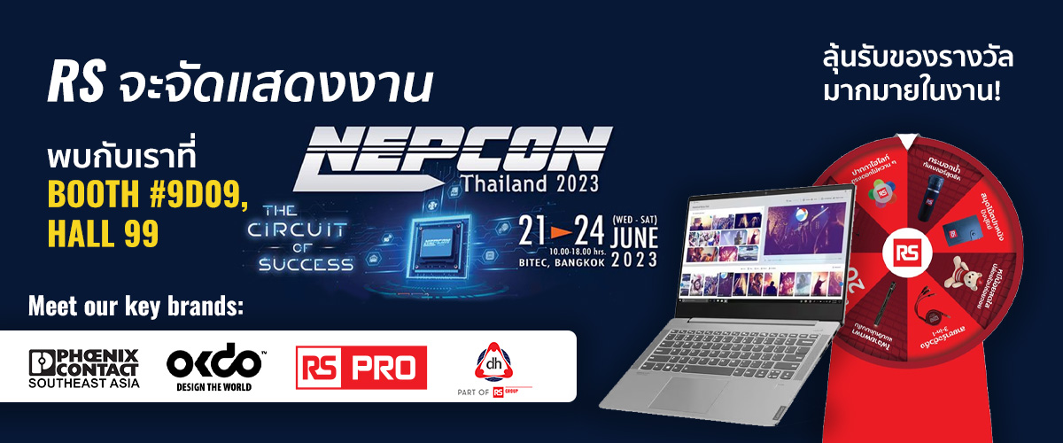 พบกับ RS Group ได้ในวันที่ 21 – 24 มิถุนายน ที่ศูนย์นิทรรศการและการประชุมไบเทค บางนา ภายในงาน NEPCON Thailand 2023 และค้นพบนวัตกรรมและผลิตภัณฑ์ที่พลิกวงการอุตสาหกรรมจากแบรนด์ชั้นนำ ได้แก่ Phoenix Contact, OKDO, RS PRO และ Domnick Thailand