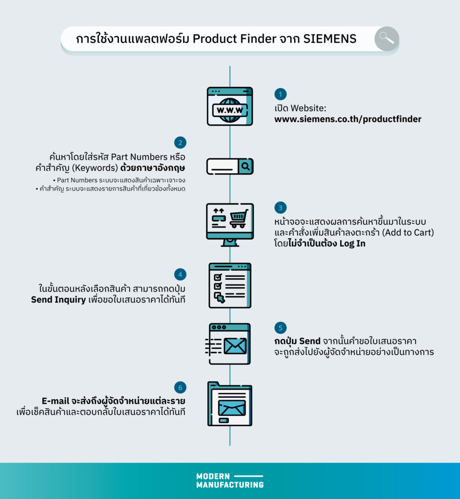 จุดเด่นสำหรับแพลตฟอร์ม Product Finder นี้ คือ ใช้งานง่าย สามารถค้นหาสินค้าอย่างแม่นยำเพราะจัดการข้อมูลโดยSiemensเอง ทั้งรหัสสินค้า สเปคสินค้า ภาพ แคตตาล๊อก บอกรายชื่อผู้จัดจำหน่ายที่มี Stock และที่สำคัญยังสามารถขอใบเสนอราคาได้อย่างรวดเร็วจากหลากหลายตัวแทนได้มากเท่าที่ต้องการ โดยมีขั้นตอนง่าย ๆ ดังนี้