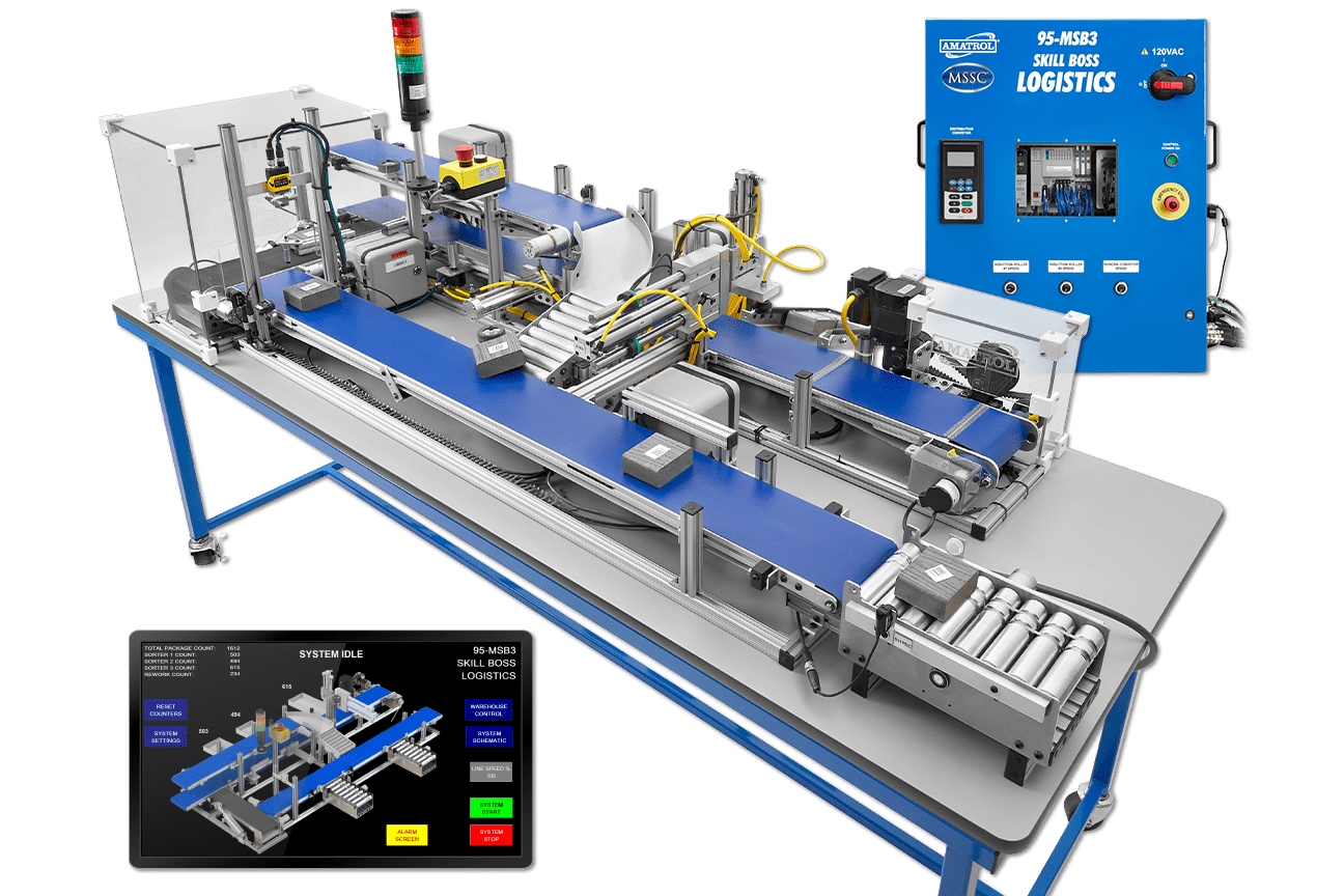 Skill Boss Logistics (95-MSB3) เป็นเครื่องมือสำหรับการประเมินทักษะความสามารถด้านการบริหารจัดการ Material Handling สำหรับนักเทคนิคด้านระบบอัตโนมัติสำหรับซัพพลายเชน ระบบจะทำงานการกระจายสินค้าอัตโนมัติในรูปแบบที่ทำงานกันจริง เช่น การติดตามบรรจุภัณฑ์ การจัดคิวบรรจุภัณฑ์แบบอัตโนมัติ และการปล่อยตามลำดับ การจัดเรียงโดย Electro-Pneumatic และอื่น ๆ อีกมากมาย