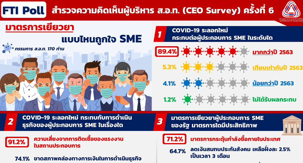 ผลการสำรวจ FTI Poll เผย ผู้บริหาร ส.อ.ท. ส่วนใหญ่ ต้องการให้ภาครัฐออกมาตรการเยียวยาช่วยเหลือ SME ในการลดภาระค่าใช้จ่ายในการประกอบการ
