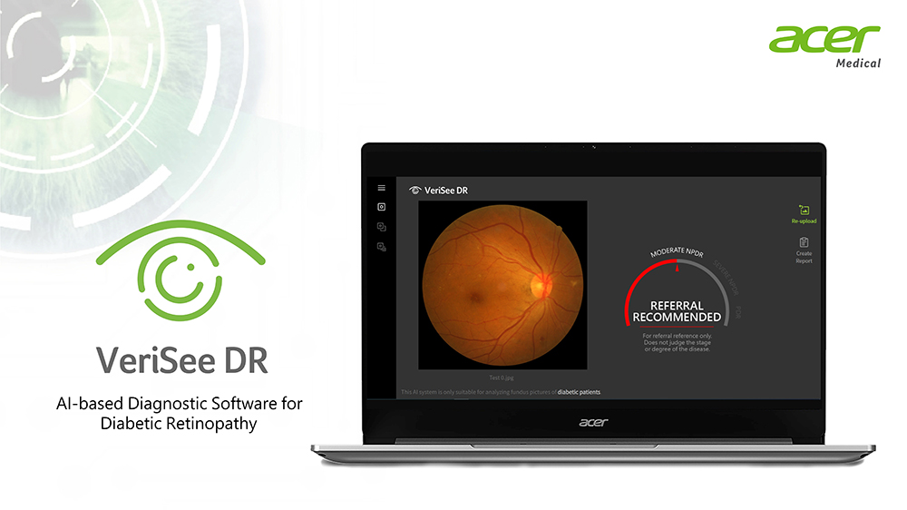 แบรนด์ Acer Medical ใช้เทคโนโลยี AI พัฒนาโซลูชั่น VeriSee DR เพื่อช่วยวิเคราะห์ภาพจอประสาทตาที่ส่งสัญญานภาวะโรคเบาหวานขึ้นจอตา (DR) ทำให้แพทย์สามารถวินิจฉัยได้เร็วขึ้นตั้งแต่เนิ่นๆ ความสามารถของโซลูชั่น VeriSee DR ถือว่าแม่นยำระดับใกล้เคียงกับจักษุแพทย์ด้วยอัตราความถูกต้องแม่นยำอ้างอิงสูงถึง 93% โรงพยาบาลทหารผ่านศึกไทจงพบว่า หลังจากได้ใช้งานโซลูชั่นดังกล่าว ความรวดเร็วและแม่นยำในการวินิจฉัยโรคดีขึ้นอย่างมาก ด้วยความจำเพาะอ้างอิงเพิ่มขึ้นจาก 50% เป็น 84%