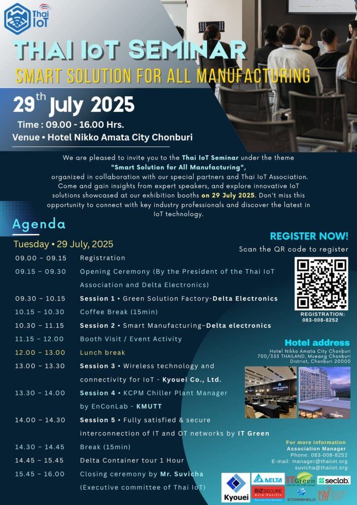 ร่วมรับฟังข้อมูลเชิงลึกจากวิทยากรผู้เชี่ยวชาญ พร้อมทั้งเยี่ยมชมโซลูชั่น IoT นวัตกรรมใหม่ ๆ ที่จัดแสดงภายในงาน ซึ่งจะจัดขึ้นในวันที่ 29 กรกฎาคม 2568 ณ โรงแรมนิกโก้ อมตะซิตี้ ชลบุรี เวลา 09.00 – 16.00 น.