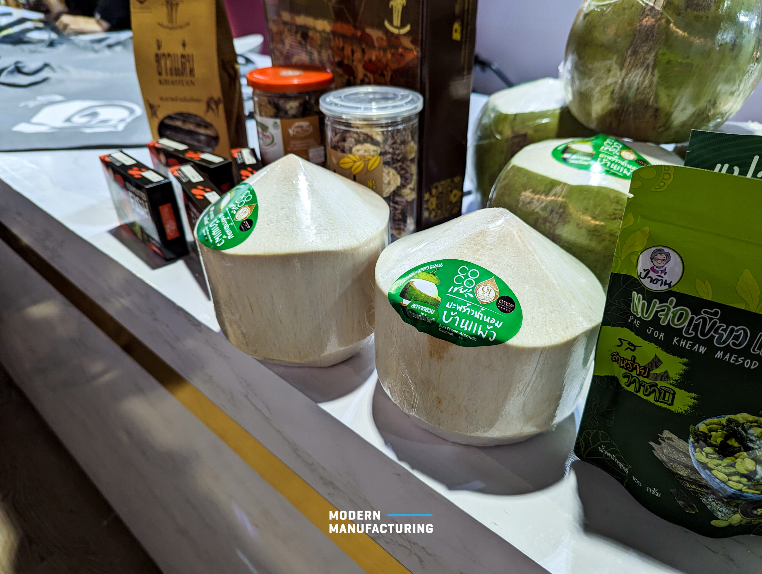 สำหรับใครหลายคนที่ยังไม่รู้จักว่าเครื่องหมาย GI นั้นคืออะไร และสำคัญอย่างไร GI หรือ Geographical Indication หรือเครื่องหมายสิ่งบ่งชี้ทางภูมิศาสตร์ที่ใช้กับสินค้าที่มาจากแหล่งผลิตที่เฉพาะเจาะจง ซึ่งคุณภาพหรือชื่อเสียงของสินค้านั้นๆ เป็นผลมาจากการผลิตในพื้นที่ดังกล่าวเท่านั้น ไม่อาจหาจากที่อื่นได้ เช่น แชมเปญต้องผลิตจากแคว้น Champagne ประเทศฝรั่งเศสเท่านั้นนอกเหนือจากนั้นถือเป็น Sparkling Wine หรือ แฮม Jamon Iberico ที่ต้องผลิตจากหมู Iberico ที่พบได้เฉพาะแถบสเปนบนเทือกเขาและเลี้ยงด้วย Acorn เท่านั้นเป็นต้น ซึ่งในงาน THAIFEX – ANUGA ASIA 2023 ก็มีผลิตภัณฑ์ที่ได้รับการรับรองเครื่องหมาย GI มานำเสนอภายในงานเป็น Pavilion ที่น่าจับตาอีกแห่งเช่นกัน ยกตัวอย่าง มะพร้าวน้ำหอมจากบ้านแพ้วที่มีเอกลักษณ์โดดเด่นไม่เหมือนใครและไม่อาจหาได้จากที่ภูมิศาสตร์อื่น ๆ บนโลก เครื่องหมาย GI จึงถือเป็นหมุดหมายใหม่ที่ดีสำหรับผลิตภัณฑ์พื้นบ้านที่เพิ่มมูลค่าในตลาดได้เป็นอย่างดี