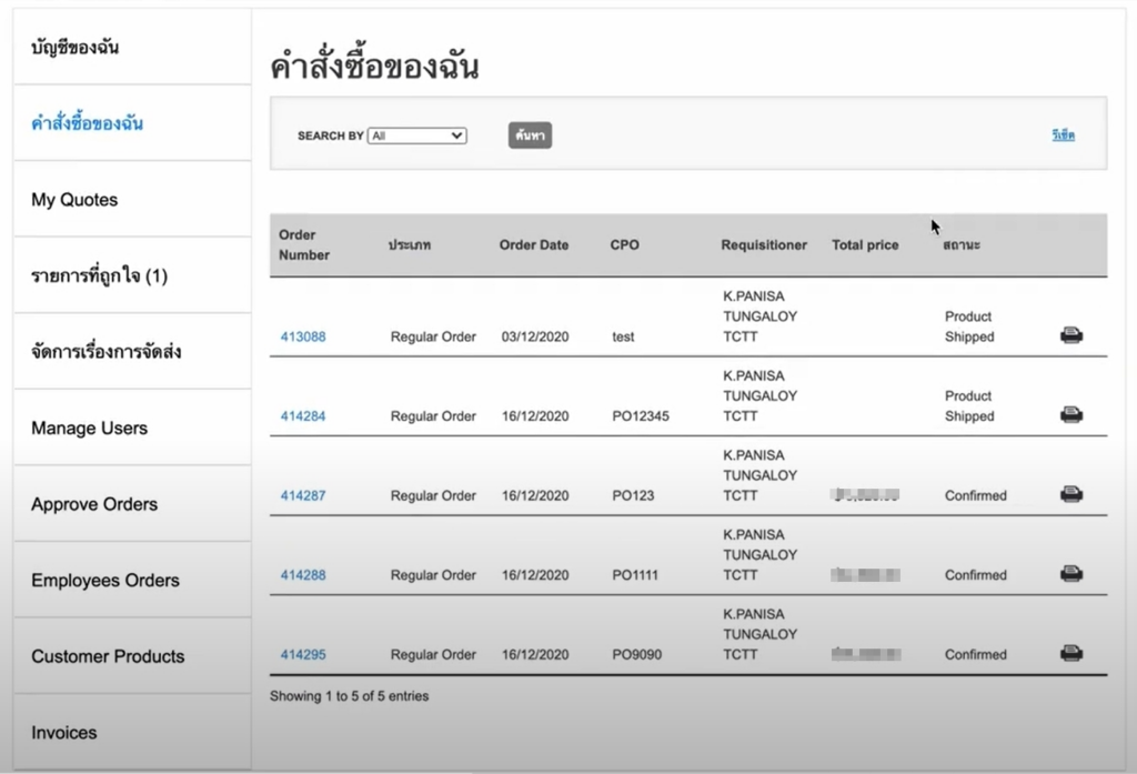 เมนูนี้น่าจะถูกใจหลาย ๆ แผนก เพราะใช้งานสะดวกและเรียกดูรายงานได้ง่าย ที่สำคัญคือสร้างความโปร่งใสให้กระบวนการทำงาน ขั้นตอนไม่ยุ่งยากเพียงลงชื่อเข้าใช้และกด ‘บัญชีผู้ใช้’ จากหน้าโฮมเพจแล้วเลือก ‘คำสั่งซื้อของฉัน’ สามารถดูสถานะได้ 3 ขั้นตอน ได้แก่