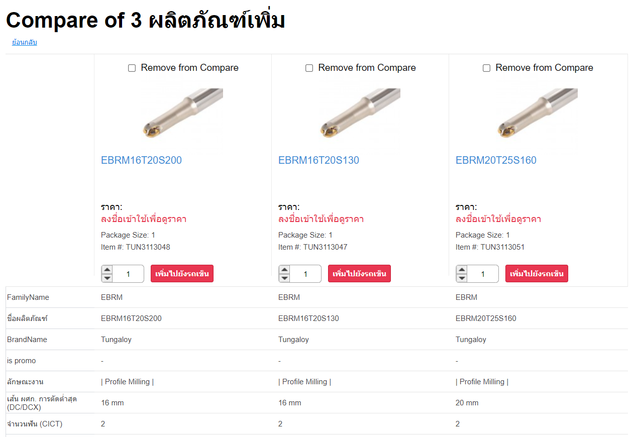 Webshop ของ Tungaloy คิดมาครบจริง ๆ ในรายละเอียดสินค้าหลังจากกดเครื่องหมาย + แล้ว ยังสามารถติ๊กเลือกสินค้ามาเปรียบเทียบกันในรูปแบบคอลัมน์ได้อีกด้วย