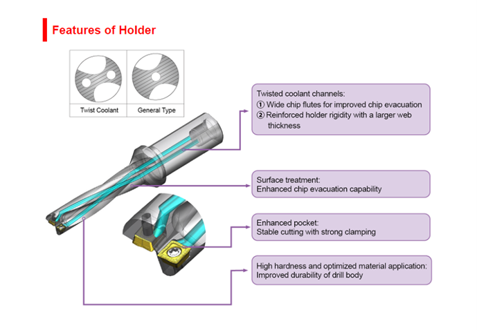X-Drill รุ่นใหม่นี้ช่วยให้สามารถใช้มุมทั้ง 4 มุม เพื่อลดต้นทุนการซื้อเม็ดมีด และยังเพิ่มประสิทธิภาพในเวลาเดียวกัน ถูกออกแบบมาด้วยเทคโนโลยีที่เป็นกรรมสิทธิ์เฉพาะของ YG-1 เพื่อให้การคายเศษมีประสิทธิภาพดีที่สุด ระบบ Internal Coolant แบบ twist และพื้นผิวของร่องคายเศษที่ถูกออกแบบมาเพื่อการคายเศษที่ราบรื่น ทำให้กระบวนการทำงานมีความเสถียรและแม่นยำ