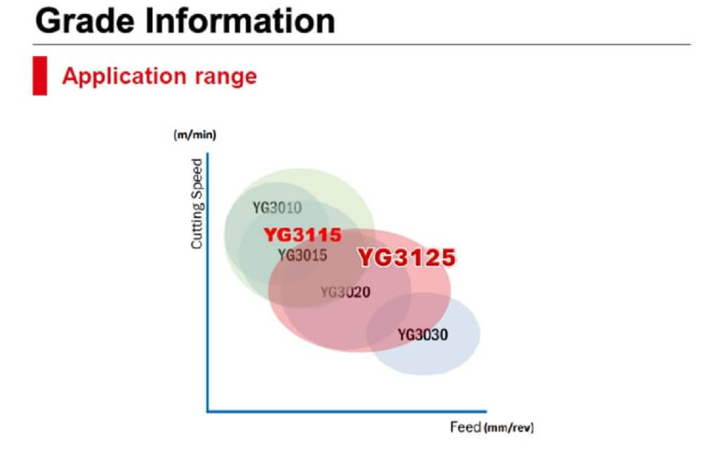 YG3115 เหมาะกับสายการผลิตปริมาณมาก (mass production) ที่ใช้ความเร็วสูงต้องการเครื่องมือที่มีอายุการใช้งานยาวนาน และเสถียรแม้ในสภาพตัดหนัก